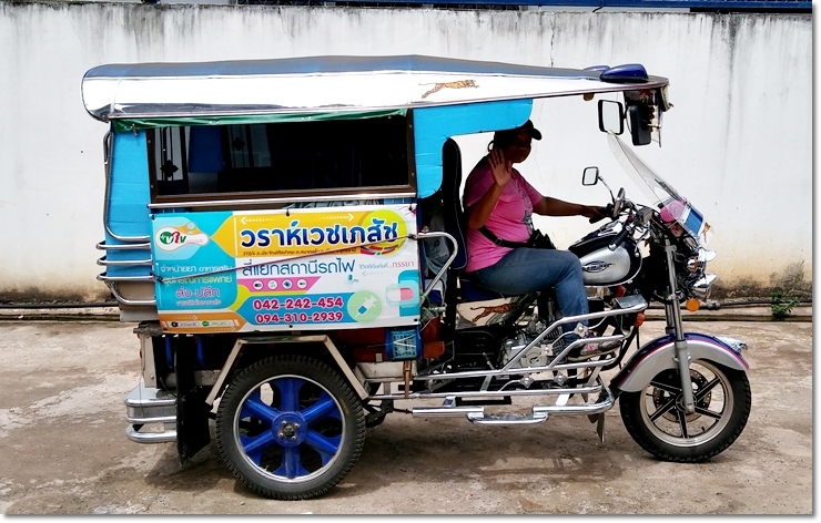 뚝뚝이 뒤에 타고 가는데 차에 완충장치가 없어서 엄청 튄다. 목적지에 대한 자신이 없는 그 기사 아줌마는 길이 갈라지는 곳이 나오면 백미러로 나를 보며 태국 말로 “이쪽이에요?”라고 물으면 나는 한국말로 “아니 왼쪽 길이요” 하며 길을 가르쳐 주며 가기를 20분, 나는 네비를 보랴 길을 확인하랴 엄청 바쁜데 목적지에 다 온 뒤 네비는 오른쪽 작은 골목길을 가리킨다. 길이 너무 좁아 조금 의심스럽지만 이럴 때 리더가 흔들리면 안 된다. 과감하게 “오른쪽 골목으로 들아가요” 하니 아줌마는 조금도 주저하지 않고 잽싸게 우회전해서 골목길로 들어간다.