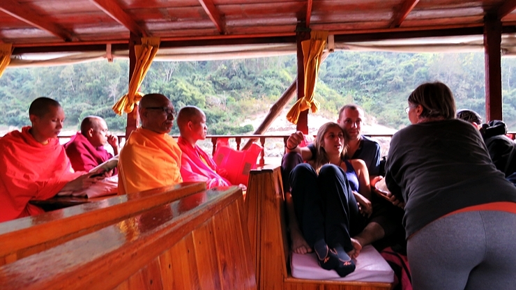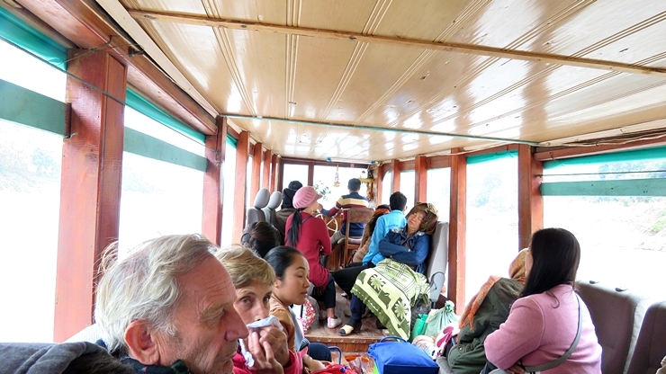 ▼ 배에는 지정석이 없어 각자 마음에 맞는 자리에 먼저 가서 앉으면 된다. 좌석은 걱정과는 달리 마주 앉는 의자에 가운데 탁자가 있는 형태다. 옹색하지 않아 장거리 여행을 하는데 큰 불편이 없어 보여 우선 안심이 된다. 호화여객선은 아니지만 세계에서 10위 안에 드는 메콩강을 이틀동안 거슬러 올라가는 대 장정(?)은 그렇게 쉽게 할 수 있는 여행 방법은 아니다. 배도 엉성하고 주위 경관이 뛰어나지 않지만 특이하지도 않고 아직은 덜 개발된 강변의 풍경을 부담없이 보면서 가는 여행도 그리 초라한 것은 아니다.