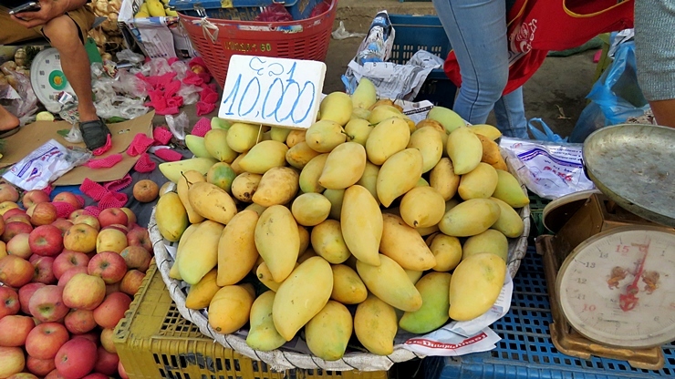 ▼ 스치로폴에다 아무렇게나 써서 상품 위에 올려 놓은 숫자가 과일 값이다. 10,000킵에다 0.13을 곱하면 한국 돈 단위가 된다.