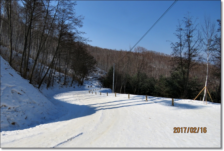 주차장 건너편에 자작나무 숲길로 올라가는 입구가 있는데 자동차 통행은 금지다. 구름 한점 안 보이는 화창한 날씨에 천천히 걷는 눈길은 더할 수 없는 힐링 방법이다.