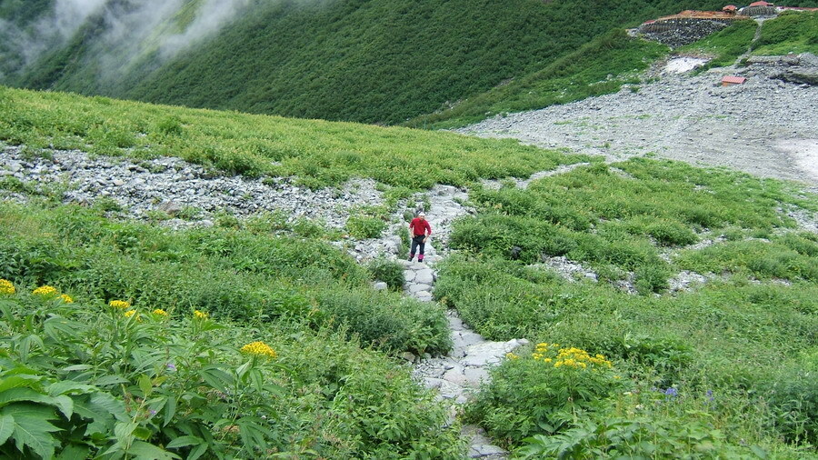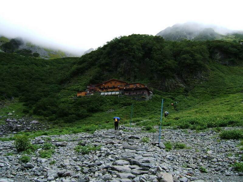 시야가 가린 구름 속을 위만 보고 힘들게 올라가기 2시간, 마침내 호다카다케 산장을 오르는 돌계단이 나타난다. 이 호다카다케 산장은 능선 위 좁은 안부에 어렵게 자리를 잡았는데 맑은 날 위에서 내려다보면 참으로 산장이 들어설 자리가 아닌데 용케도 산장을 지었다는 감탄을 하게 된다.