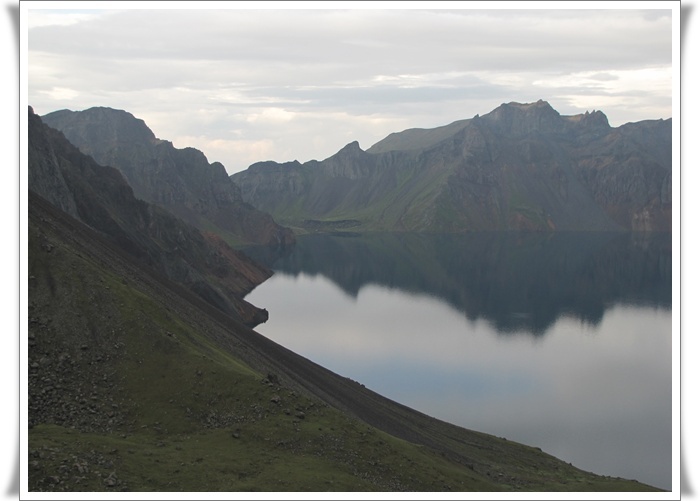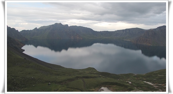 4호 경계비에서 바라본 천지의 모습, 건너편 오목한 부분이 달문, 우측 봉우리가 천문봉, 천지의 얼음은 다 녹았지만 드문드문 눈의 모습이 보인다. 천지에 비친 산 그림자가 산보다 더 선명하다.