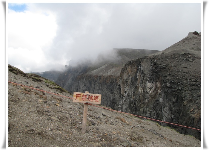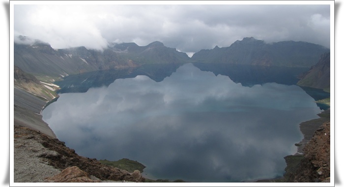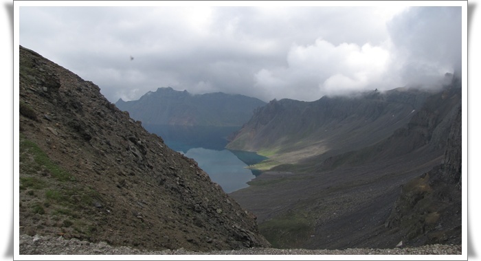 나무하나 풀하나 보이지 않는 천지를 둘러싼 능선에는 구름이 모였다 흩어졌다 종잡을 수 없는 상황이 연출 된다. 날씨가 더 악화되기 전에 천지 부터 보는 것이 급선무다. 우리 일행은 부지런히 달려 간다.
