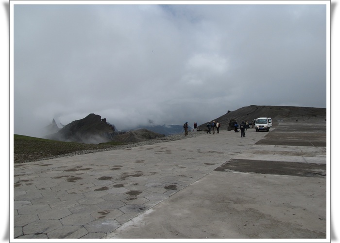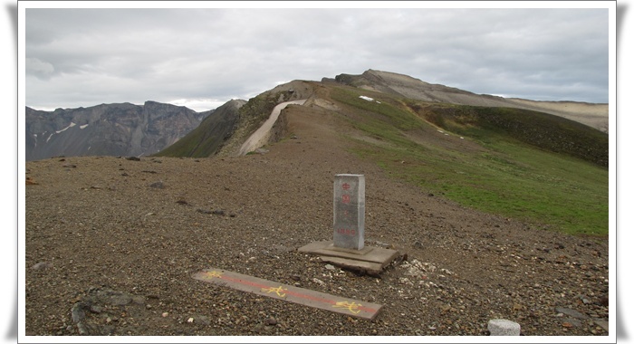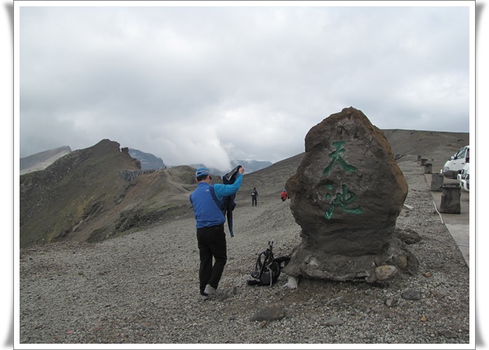 드디어 능선 주차장에 도착을 했다. 천지라고 표시된 커다란 바위가 우뚝 서있고 나무하나 없는 황량한 주위 풍경은 쓸쓸함 그 자체인데 그래도 천지를 보고자 하는 열망으로 우리의 마음은 바쁘기만 하다. 앞에 보이는 봉우리 아래 4호 경계비가 있다고 하니 부지런히 가보는 수 밖에......