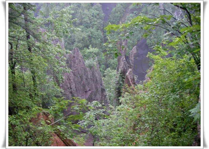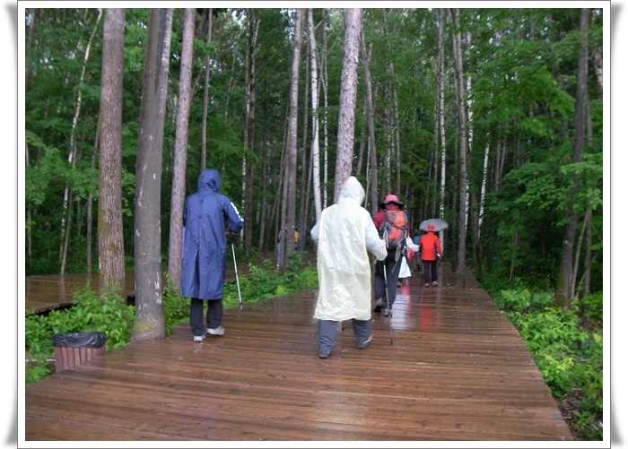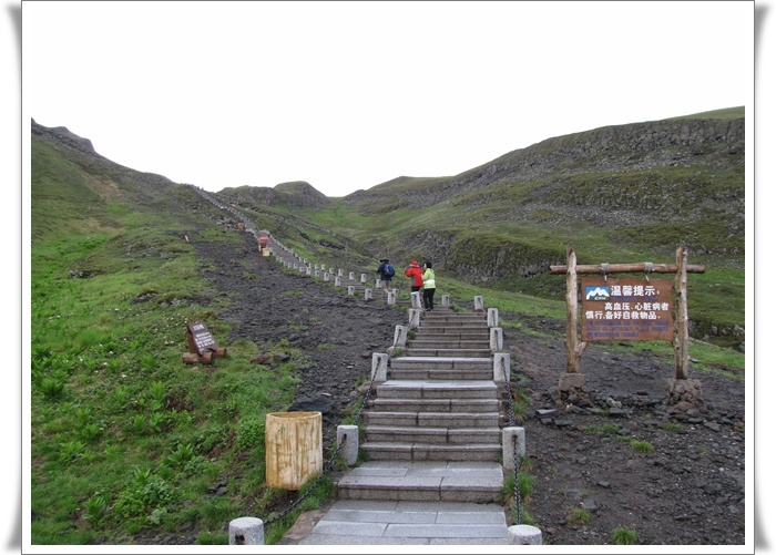 우리가 이번에 오를 백두산은 천지를 둘러싼 능선중 남쪽의 4호 경계비와 , 서쪽의 5호 경계비, 북쪽의 장백 폭포 지역등 세 방향과 서쪽의 5호 경계비에서 북쪽의 소천지까지의 능선 종주로 중국령은 거의 답파를 하게 된다. 첫날 장춘에서 백두산 근처의 송강하 까지 힘든 일정을 마친뒤 둘째날 아침 일찍 우리는 계획대로 남쪽의 백두산 입구를 향해 출발을 했다. 이곳 이름으로 남파까지는 차로 약 1시간 반정도의 거리인데 우리의 기대를 저버리고 출발 부터 비는 주룩주룩 잘도 내린다. 백두산의 날씨는 일기 예보와는 상관이 없고 아래와 산 위는 또 별개의 상황이니 일단은 출발, 얘기를 듣기로는 남파까지 가는 길에 북한령을 잠시 지나 간다는 조금은 걱정되는 소문도 있었는데 그 것은 어디까지 소문이고 깨끗하게 포장된 자동차 길은 차량의 왕래도 뜸하고 양쪽의 울창한 수림 지역이 백두산의 큰 규모를 말해주는 듯하다.